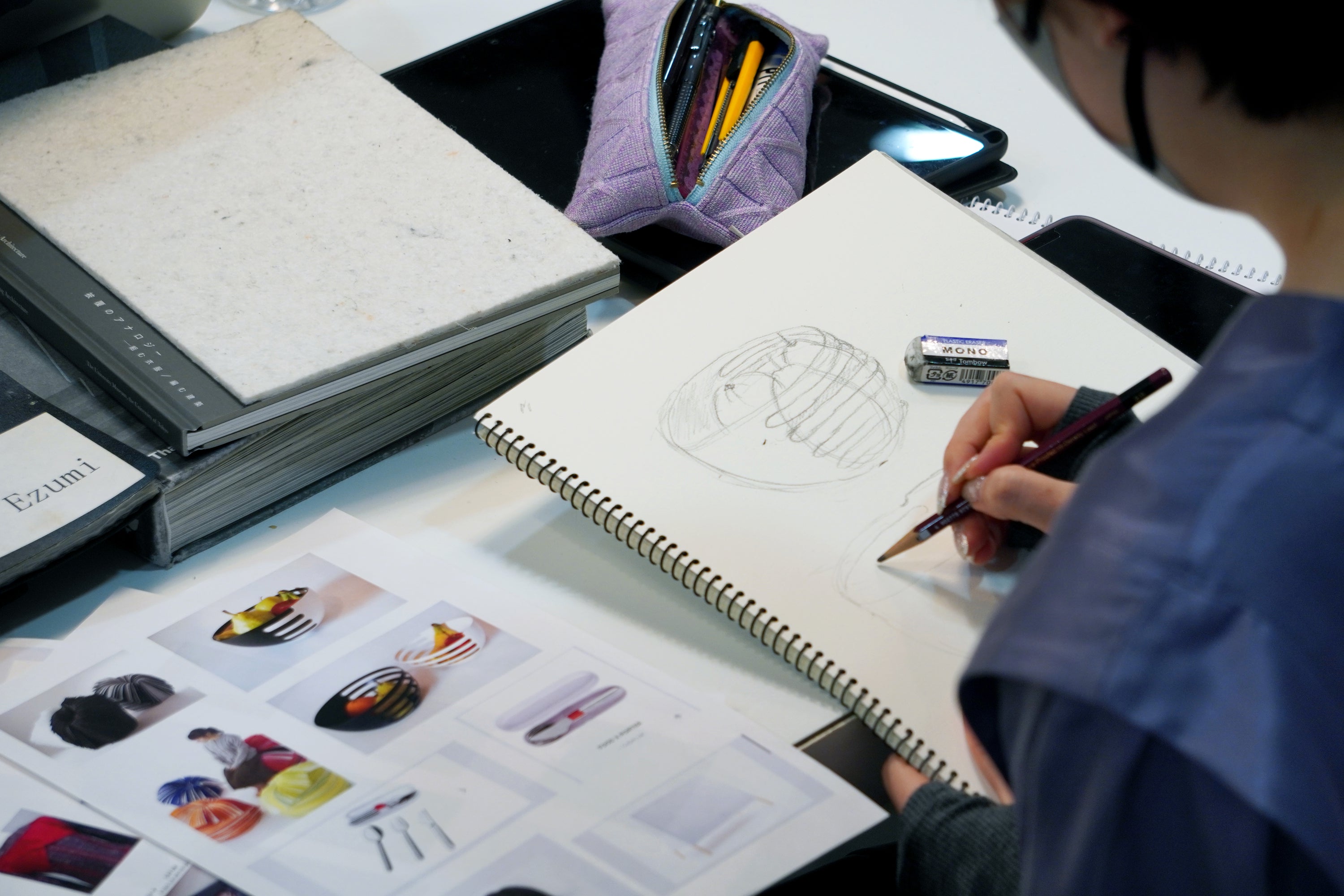 数年前に江角さんの歴代コレクションのスケッチブックを拝見した時の驚きは忘れられません。それが、英国の名門アートスクール、セントラル・セント・マーチンズでは一般化されている「スケッチブック・メソッド」であるということを知り、ぜひ取材したい!とお願いしたところ、「体験してみて!」ということで、ゼロ期生として参加する機会をいただきました。最初はデザインシンキングのレッスンです。お題に対してリサーチとリフレクション、そしてマインドマップを繰り返し、どんどんアイデアを出してプロトタイピングをイメージするのですが、江角さんによるチュートリアルが絶妙で、さらに思考が前進!ということで毎週とても楽しい学びの連続でした。また、多様な分野でプロとして活躍していらっしゃる同期の方々との会話からの気づきも大事な宝物に!改めて、ものづくりを生業としている人はもちろんのこと、クライアントワークへのヒントやアカデミズムへの応用など、次のDirectionをクリエイトするのに有効な私塾です。二本木志保